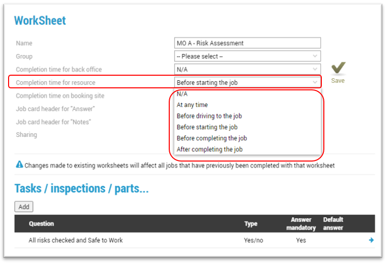 Where you need your mobile workers to complete a check before they start working, if you have one or more mandatory questions, you can set the ‘Completion time for resource’ on the worksheet to ‘Before starting the job’. This requires mobile workers to answer those crucial questions before they can get started on their job.
